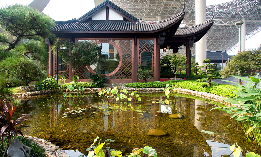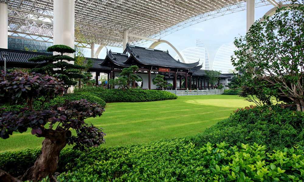 G20峰會(huì)主會(huì)場(chǎng)空中花園施工內(nèi)容包括屋頂花園景觀、仿古建筑、水體景觀積水循環(huán)系統(tǒng)等。屋頂花園整體以“西湖明珠從天降、龍飛鳳舞到錢塘”為設(shè)計(jì)理念,以典型的江南園林風(fēng)格為范本,吸收了中國(guó)古典園林中多種造景元素,詩(shī)意地闡釋了江南園林的獨(dú)特韻味。水景、植栽、石景和建筑相互輝映,傳統(tǒng)江南園林的工匠精神與哲學(xué)思考深蘊(yùn)其中,展現(xiàn)細(xì)致入微且非常玄妙的獨(dú)特美感。是國(guó)內(nèi)功能齊全,中國(guó)特色濃郁,生態(tài)環(huán)境優(yōu)美的屋頂花園。